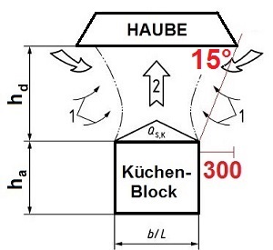 - Überstand Küchenblock zur Dunstabzugshaube 300 mm im Winkel von 15°