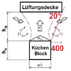 - Ausführung der Lüftungsdecken im Winkel von 20° mit ca. 400 mm seitlichen Überstand